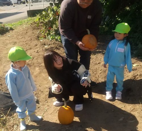 今年は1Bクラスが年少さんと一緒にカボチャを収穫しました。