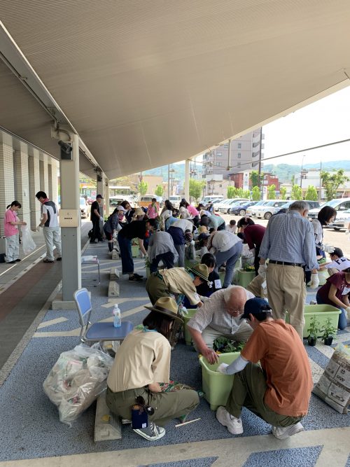 2019年5月26日(日)、午前中から猛暑の中、地域の皆さんと一緒に花を植えました。