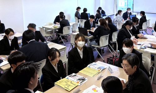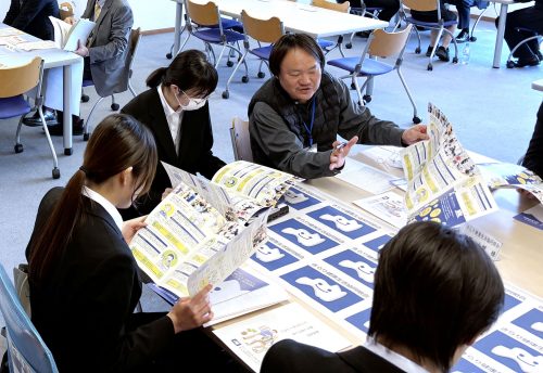 会場には4年生を中心に、次年度を見据えた3年生も含め計46名が参加。リクルートスーツに身を包んだ学生たちは、各自が関心を寄せる3つのブースを回り、真剣なまなざしで事業所担当者の説明に聞き入っていました。