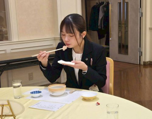 サーブされる方が見た目からも確認できるようナプキンのカラーを変えるなど、「心からのおもてなし」を実際に体験することで、自分ならどう対応し、どのようなことができるかを考えるきっかけとなりました。