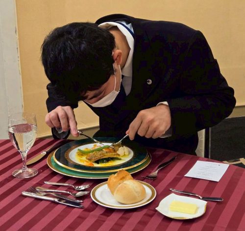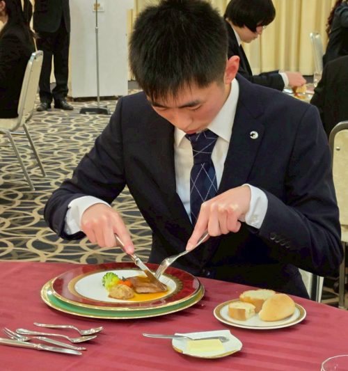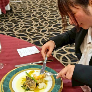 日本料理と比較し、慣れた様子でカトラリーを使い分ける様子がみられた一方、海老の殻をとる際や、肉を切り分ける際のナイフの扱い方に苦戦している姿も見られました。