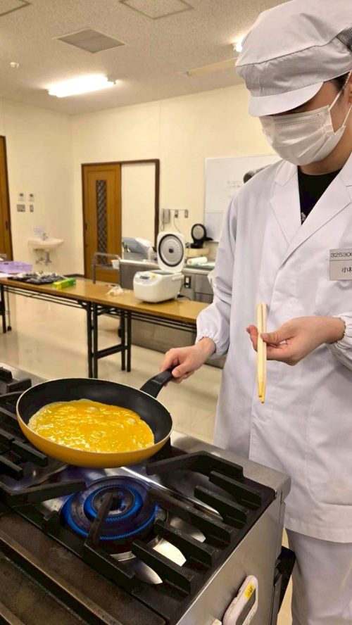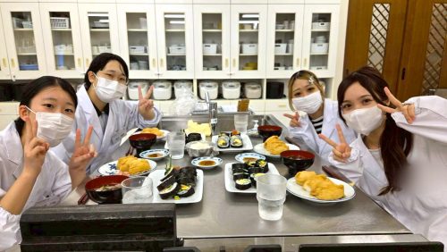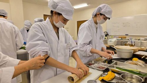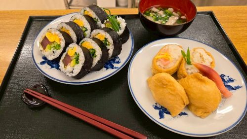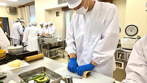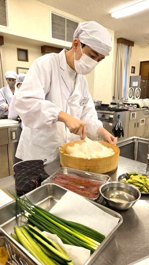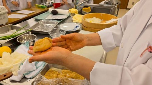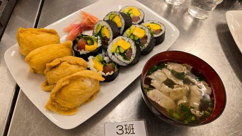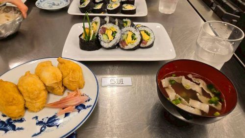 巻き寿司の他に、いなり寿司の実習も行いました。巻き寿司で使用した酢飯に、柚子と蓮根をアクセントに加えて、甘辛く煮付けた油揚げに詰めました。