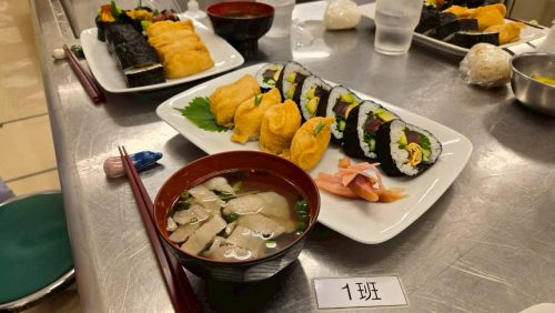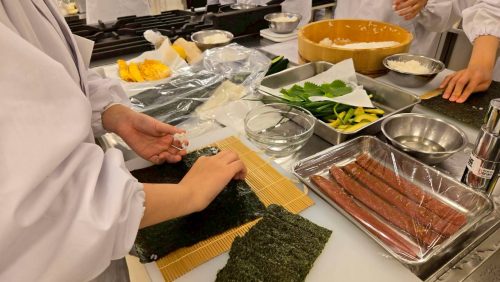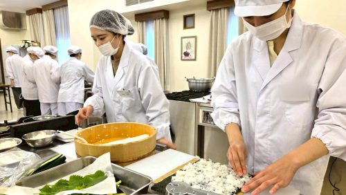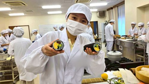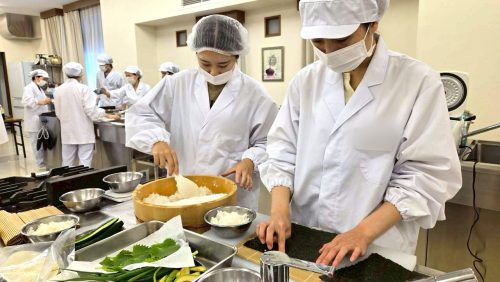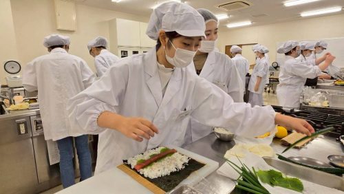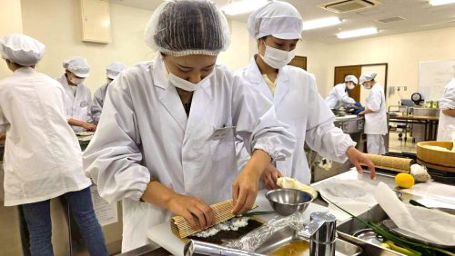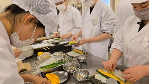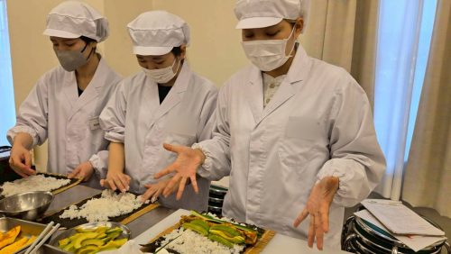 講義で学んだ巻きすの扱い方、のりの向きを確認しながら巻き寿司に挑戦!