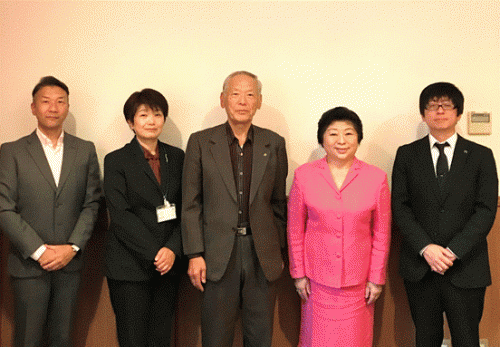 (左から、相田主幹兼次長、上田支所長、末永会長、桜田学長、木村教授)